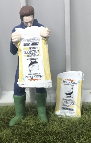 Fermier vidant un sac de nourriture pour volailles