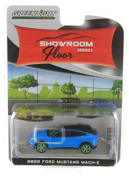 FORD Mustang MACH-E de 2022 bleu avec jantes vertes de la série SHOWROOM FLOOR sous blister