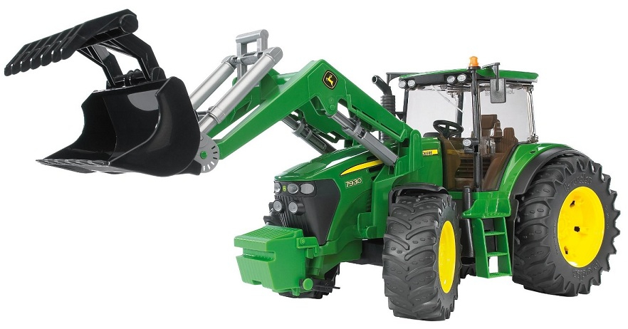 Cette miniature agricole John Deere 7930 est issue de la série 3000 de Bruder. Sa cabine est vitrée entièrement et les portes peuvent s'ouvrir. Il dispose d'un chargeur à l'avant. Le tracteur est compatible avec toutes les remorques agricoles Bruder.