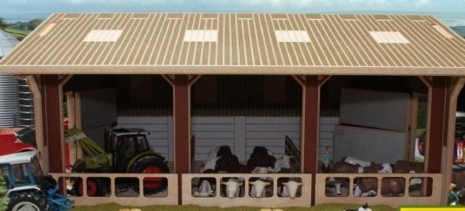 Stabulation avec filet brise-vent à l'échelle 1/32 fabriqué par BRUSHWOOD TOYS de dimensions 560x455x260mm vendu sans les vaches et matériels agricoles.