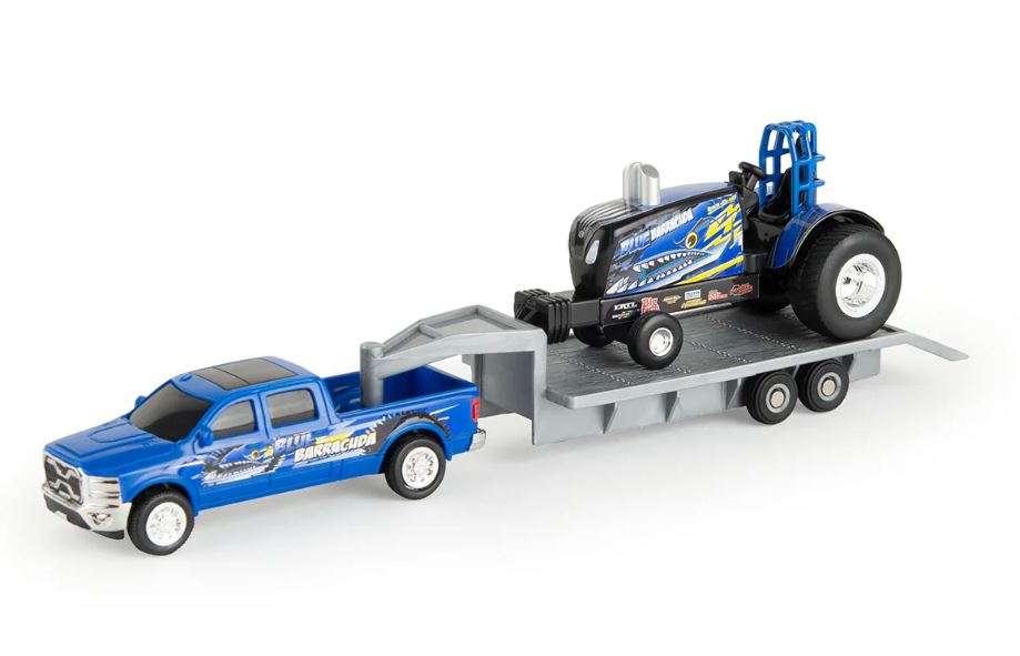 Pick-up avec remorque et tracteur pulling NEW HOLLAND Blue Barracuda