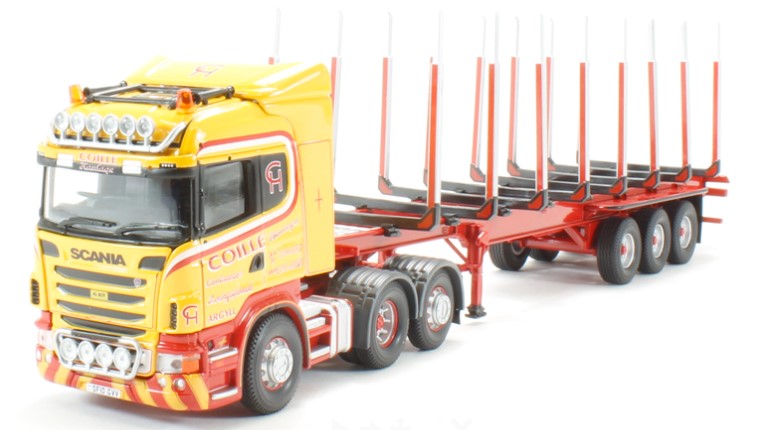 SCANIA R 6X4 jaune/rouge et porte engin 3 essieux rouge