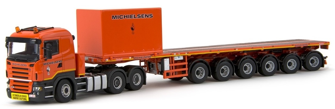 SCANIA R5 6x4 avec semi plateau 6 essieux transport de ballaste pour grue avec contenaire MICHELSEN